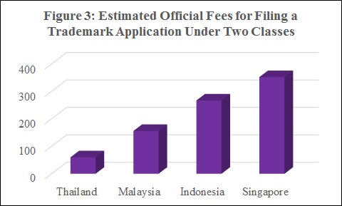 The estimated costs to get a trademark registered under two classes vary from $396 in Indonesia to $867 in Malaysia (Figure 5), of which only Malaysia and Thailand charge official fees of $284 and $36, respectively. There is no official trademark registration fee in Indonesia and Singapore. The costs are inclusive of the attorney charges for trademark registration in an additional class in Malaysia.